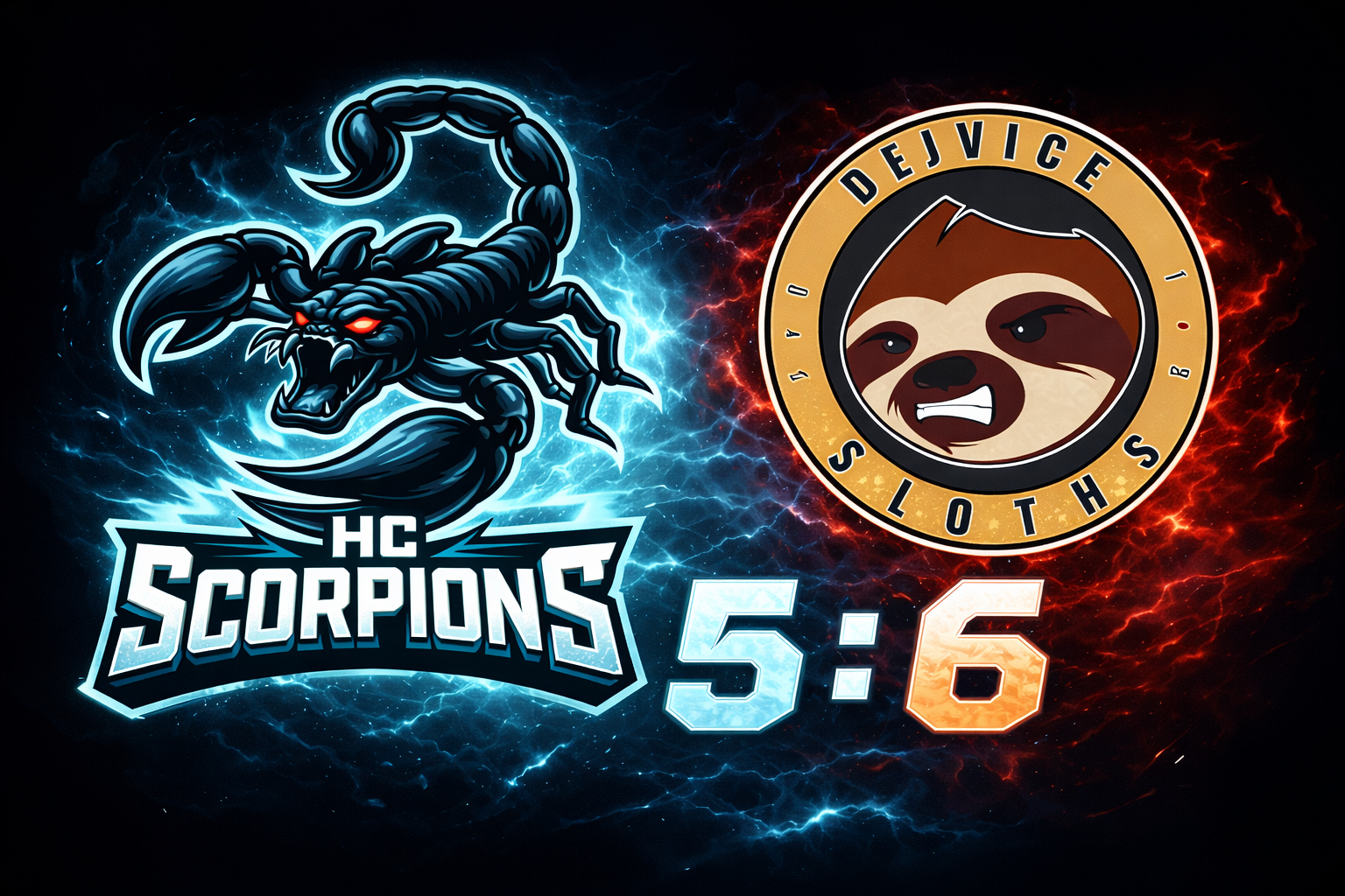 Komentář: Historicky 1. přátelský zápas HC Scorpions Praha, na který se všichni velmi těšili (včetně soupeře)! 1. třetina byla vyrovnaná a skončila výsledkem 3:2 pro Dejvické Sloths. Jeden gól jsme bohužel obdželi i po úspěšném samostatném trestném nájezdu Sloths. Ve 2. třetině nám soupeř odskočil i díky několika sólo únikům na rozdíl několika branek. Scorpions však nesklopili hlavy a ve 3. třetině se vrátili k bojovnému výkonu z první třetiny a skóre zápasu téměř vyrovnali. Občas chybělo i trochu štěstí - několikrát jsme trefili tyčku. Nakonec nám však nestačil čas na obrat a konečný výsledek ve prospěch soupeře byl tedy 6:5.